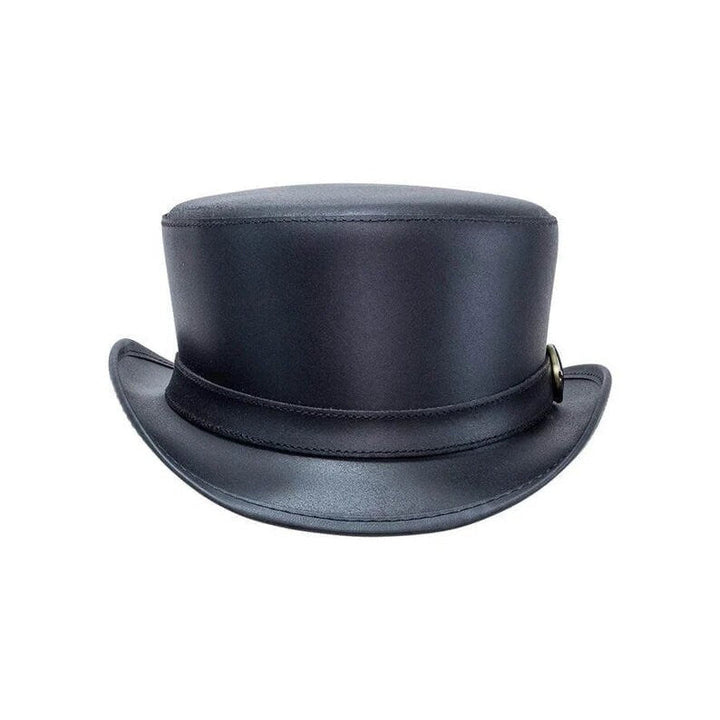 Tags: Top hat, Leather, Black, Steampunk, Gothic, Biker, Motorcycle rider, Carriage band, Unique, Edgy, Durability, Quality, Investment piece, Handmade, High-quality, Attention to detail, One-of-a-kind, Fashion-conscious.