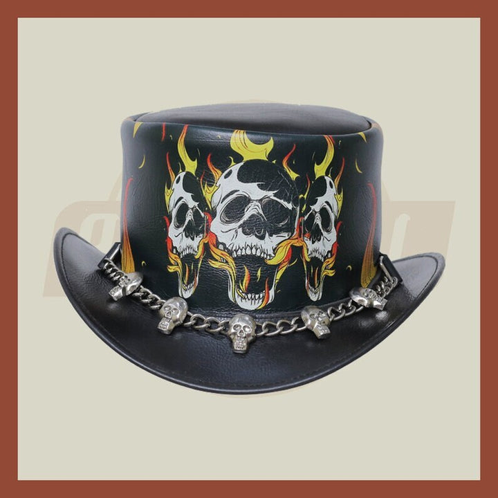 Burning Skull In Hell Leather Skull Chain Band Motorcycle Biker Rider Top Hat