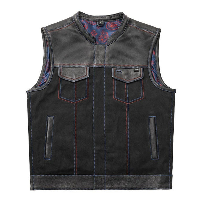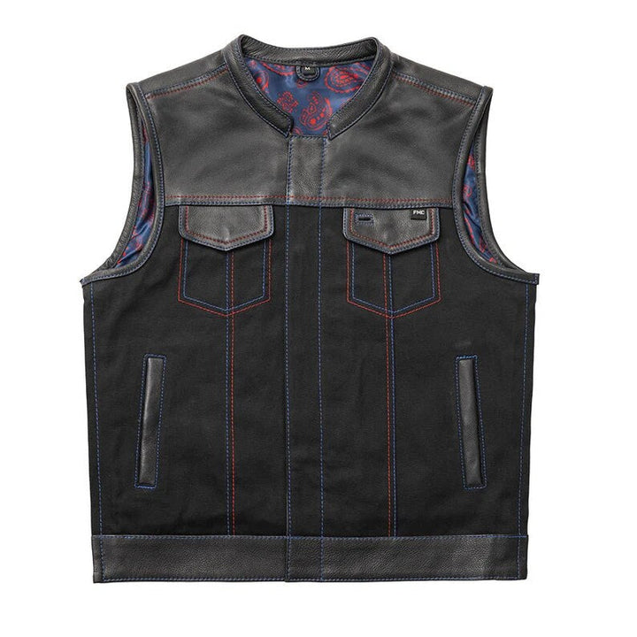Denim Vest Red Blue Paisley Biker Vest, Hunt Club Leather Builder Diamond Quilted Custom Biker Vest, leather Vest
