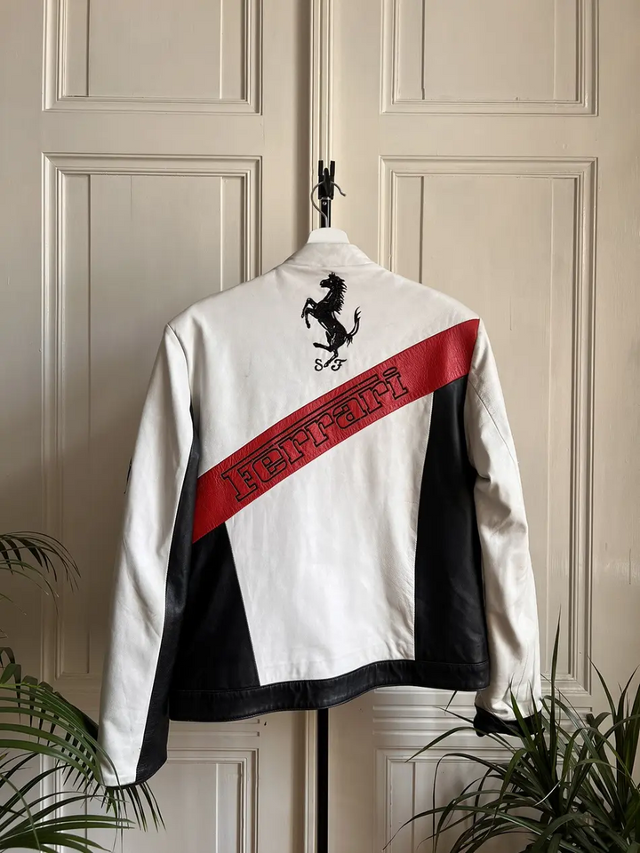 Experience the thrill of the track with this premium Ferrari Formula 1 World Championship racing jacket. Expertly crafted from high-grade genuine leather in a striking combination of white, black, and bold red panels, it ensures exceptional durability, a luxurious feel, and robust protection. The comfortable inner lining provides superior wearability, making this jacket a testament to both professional-grade quality and iconic motorsport design.