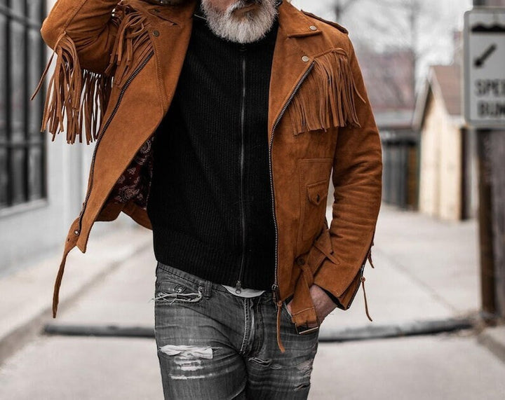 Fringe Suede Leather Belted Jacket Men's Western Style Fringe Jacket Cowboy Fringe Biker Suede Jacket