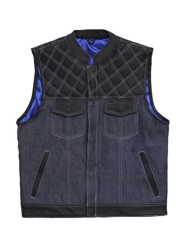 The Hand Made Blue Denim & Leather Diamond Quilted Style Thunder Biker Motorcycle Rider MC Club Vest is a stylish and durable vest that is perfect for motorcycle riders and MC club members. The vest is made from a combination of blue denim and leather, which provides both style and durability.