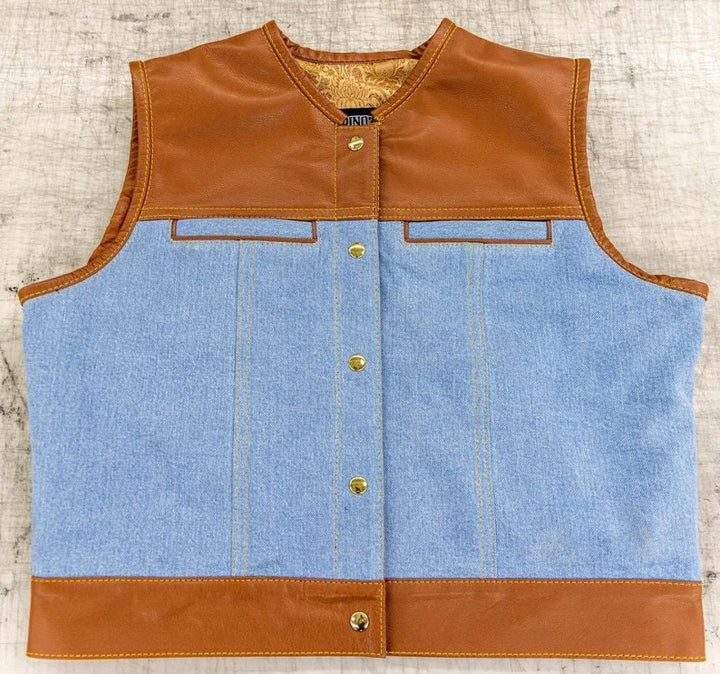 Crafted from high-quality leather, this vest features a sleek brown leather design that adds a touch of elegance and sophistication to your outfit, while the blue denim construction gives it a rugged and edgy look that is perfect for any biker. The sleeveless design makes it easy to layer over other clothing items, and the adjustable waist and side laces provide a custom fit that ensures maximum comfort while you ride.