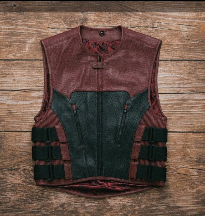 Crafted with high-quality leather and denim, this vest boasts a unique diamond-quilted design that exudes elegance and sophistication. The bold black and maroon color combination adds a touch of luxury, making it perfect for any occasion, whether you're riding your bike or attending a formal event.