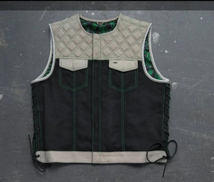 Introducing the Leather Vest White Leather Vest with Side Laces—a striking blend of classic design and contemporary style. This denim vest is crafted with meticulous attention to detail, making it the perfect addition to any biker's wardrobe.