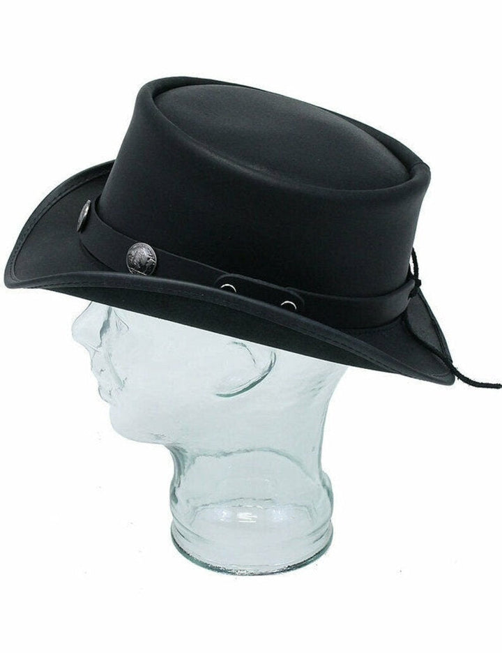 The Marlow Steampunk Deadman Biker American Five Cent Black Leather Top Hat is the perfect accessory for the biker who wants to stand out from the crowd. It's also a great gift idea for the biker in your life who appreciates the darker side of fashion.