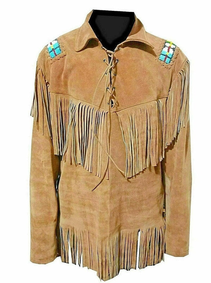 Men Brown Suede Vintage Traditional Western Cowboy Leather Jacket Lases Style Fringe Hand Made Country Side Red Indian Western Wear is made of pure leather. This jacket will make you look what you want to be and will fit you the way you want it.
