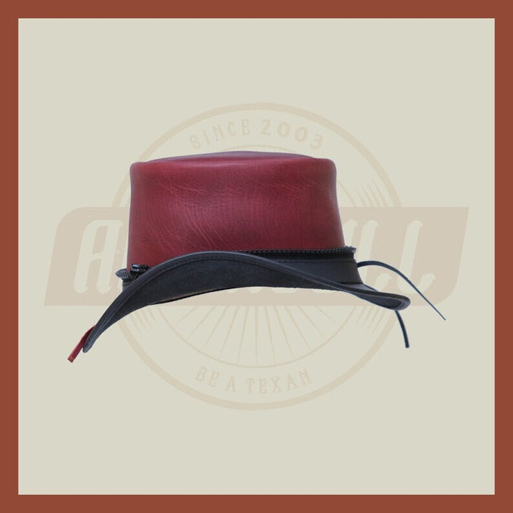 Crafted with purplish black leather, this top hat exudes a unique and daring aesthetic. The contrasting zipper detail adds an industrial and eye-catching element, perfectly capturing the essence of both biker and steampunk aesthetics.