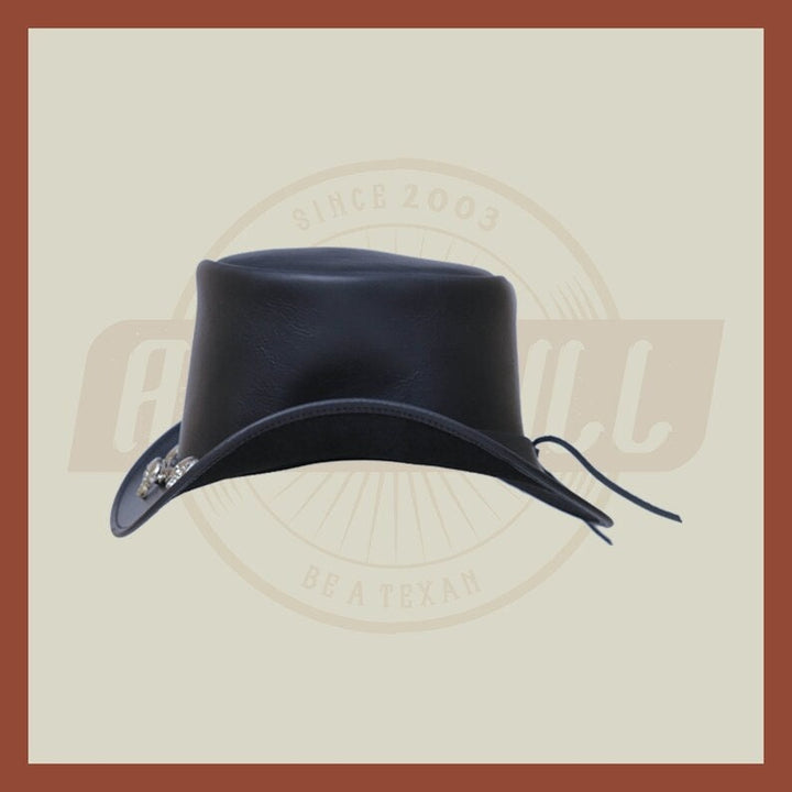 Tags: skull and chain band, black leather, steampunk, top hat, motorcycle biker, rider, rebellious spirit, individuality, fashion-forward. Leather Top Hat, black leather Hat, Mens top Hats, Womens top Hats, Steampunk hat, Custom leather Hats, Vintage hats, Western leather hats, Cowboy hat, Handmade hat, Fashion hat, Gothic hat, Biker hat