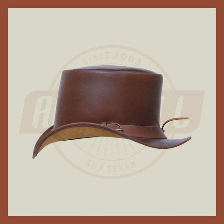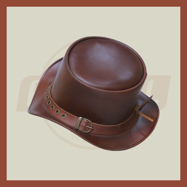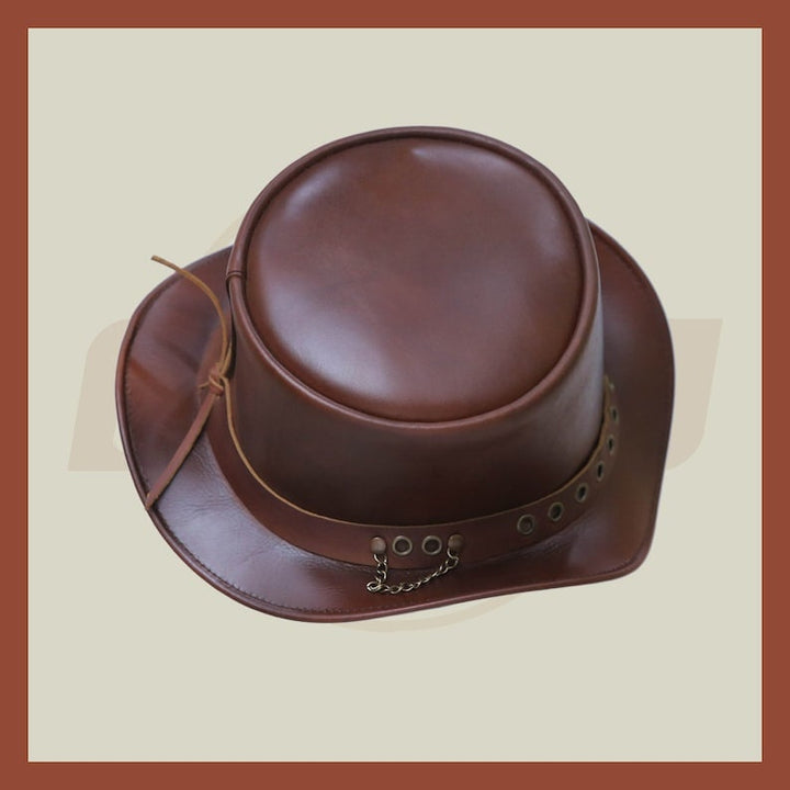 Crafted with premium brown leather, this top hat exudes a vintage and worn-in look, adding an authentic touch to your ensemble. The ring chain buckle band adds a unique and edgy element, reminiscent of the industrial era.