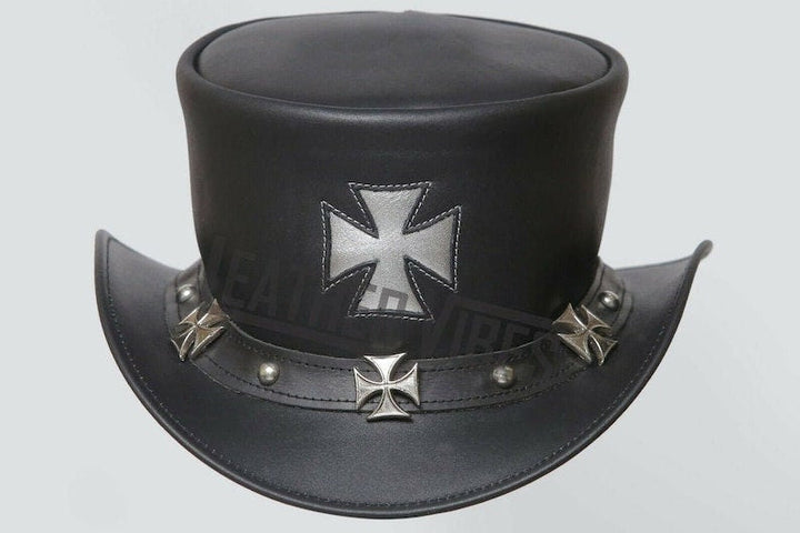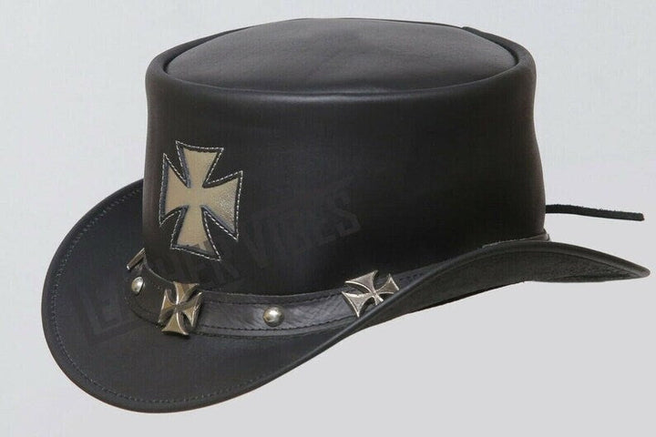 Crafted with black leather, this top hat showcases a bold and rebellious aesthetic. The standout feature is the chopper cross design, adding an element of ruggedness and individuality to your look.