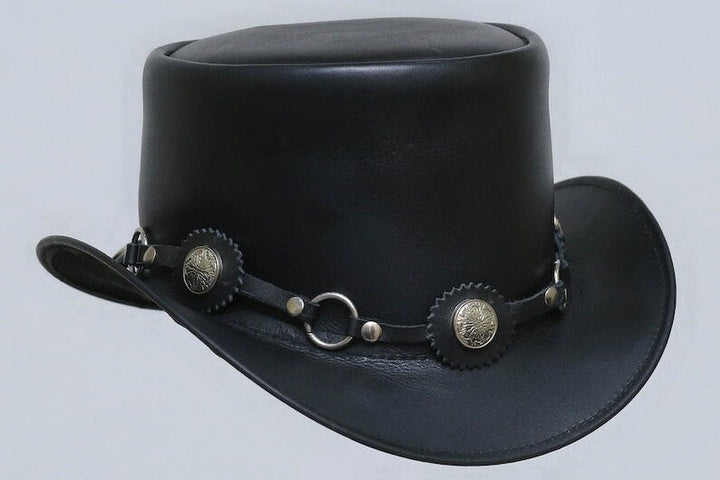 Tags: black flower concho band, leather, steampunk, wild west, top hat, versatile style, fashion-forward. Leather Top Hat, black leather Hat, Mens top Hats, Womens top Hats, Steampunk hat, Custom leather Hats, Vintage hats, Western leather hats, Cowboy hat, Handmade hat, Fashion hat, Gothic hat, Biker hat