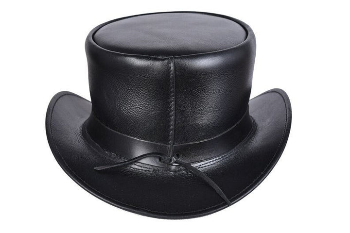 Step into an era where elegance meets innovation with our Steampunk Hat El Dorado Top Hat. Crafted with meticulous attention to detail, this black leather top hat boasts a simple yet striking band, adorned with feathers that add a touch of mystery and sophistication. It's not just a hat; it's a statement, combining the allure of steampunk with the rugged spirit of a biker's favorite accessory. Whether you're strolling through a Victorian-inspired world or hitting the open road on your motorcycle, this hat is the perfect companion, reflecting your unique style and adventurous spirit.