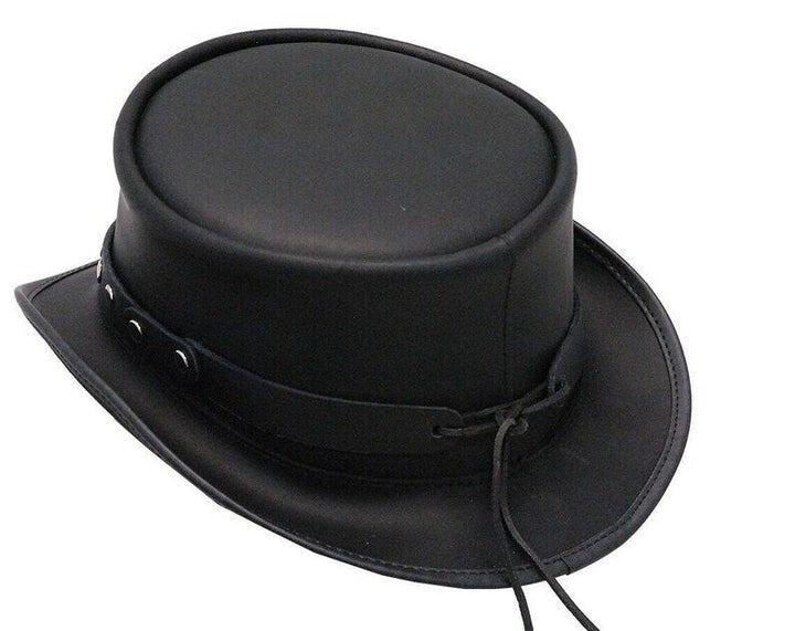 Tags: Top hat, Leather, Black, Steampunk, Biker, Rivet trim, Leather hat band, New with tags, Unique, Edgy, Durability, Quality, Investment piece, Handmade, High-quality, Attention to detail, One-of-a-kind, Fashion-conscious.