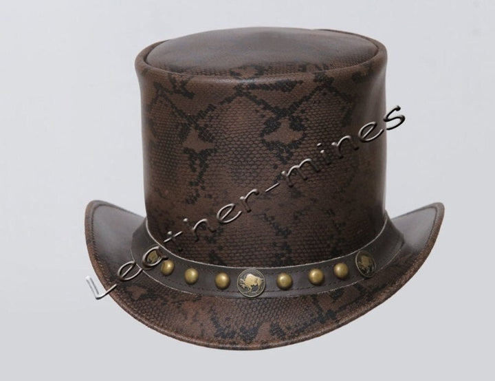 Tags: leather top hat, biker top hat, gothic top hat, men's top hat, snake style top hat, five cent band top hat, studs band top hat, brown top hat, custom top hat, rare top hat.