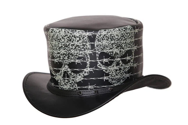 Unleash your inner rebel, embrace your dark side, and showcase your unique style with the Top Hat Razor Wire Skull Leather Hat. Elevate your fashion game, exude confidence, and let your hat speak volumes about your fearless and captivating persona.