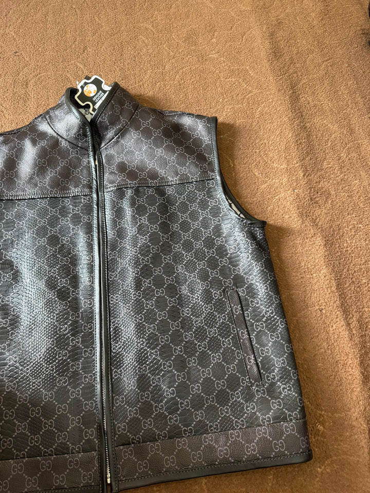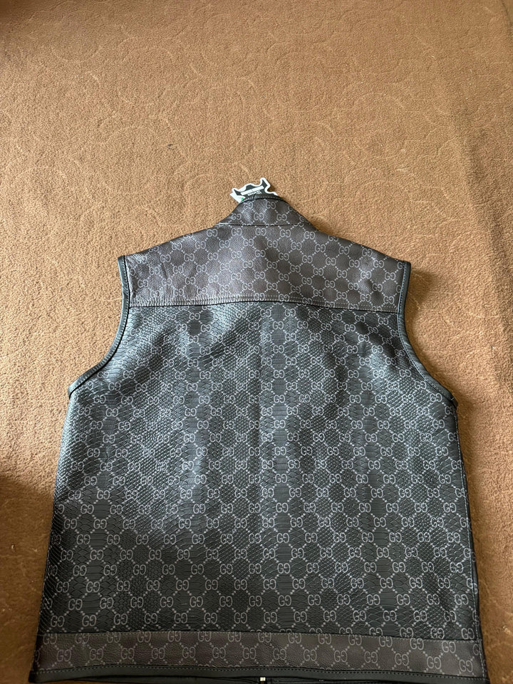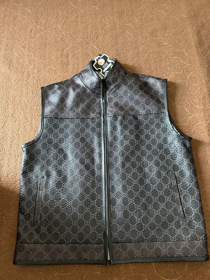 Elevate your wardrobe with this luxury designer-inspired leather vest, crafted from premium quality leather with a sleek black finish. Featuring an all-over G*Cci pattern and a minimalist sleeveless design, this vest combines streetwear edge with high-end sophistication.